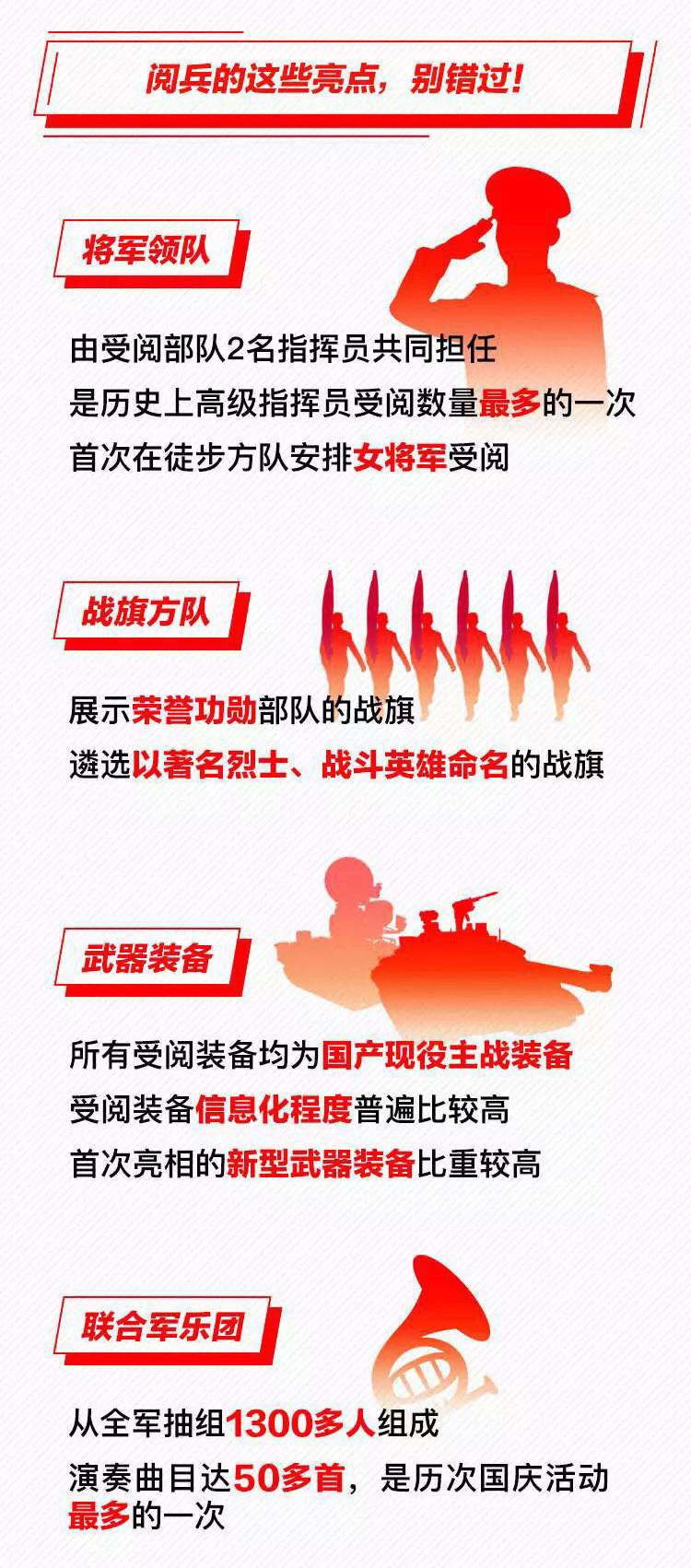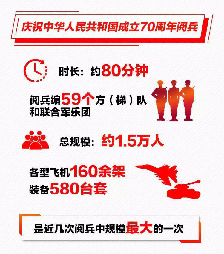 為慶祝新中國(guó)成立70周年,10月1日北京天安門廣場(chǎng)將舉行盛大閱兵式。屆時(shí),32個(gè)裝備方隊(duì)、12個(gè)空中梯隊(duì)將通過天安門廣場(chǎng),接受檢閱。此次閱兵,所有受閱裝備均為國(guó)產(chǎn)現(xiàn)役主戰(zhàn)裝備,其中包括我軍部分新型裝備,是近幾次閱兵中規(guī)模最大的一次。