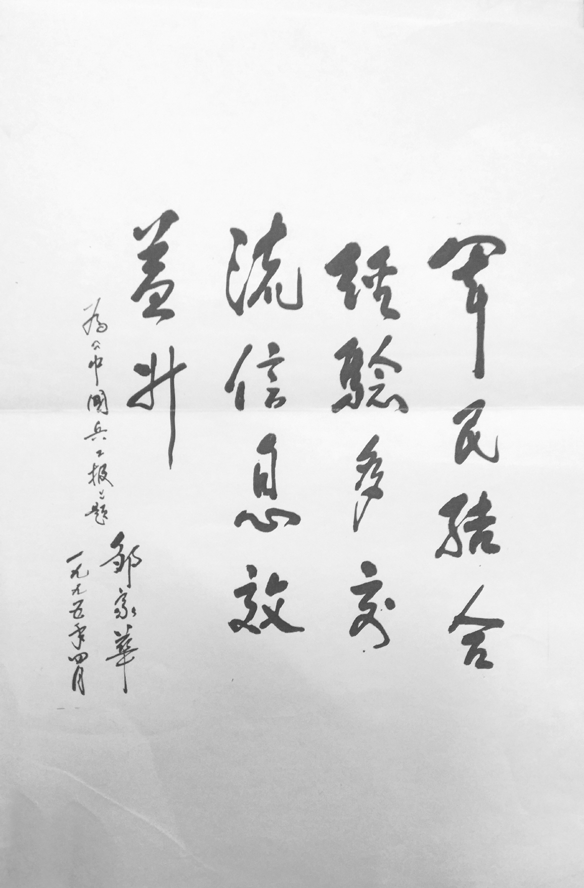 1994年11月14日,原兵器工業(yè)總公司總經(jīng)理張俊九致函時(shí)任中共中央政治局委員、國務(wù)院副總理鄒家華,懇請他為《中國兵工報(bào)》題寫報(bào)紙名稱。鄒家華對兵器工業(yè)格外關(guān)心,第一次為軍工行業(yè)即將創(chuàng)刊的報(bào)紙題寫報(bào)名(見報(bào)紙刊頭)并題詞:軍民結(jié)合經(jīng)驗(yàn)多,交流信息效益升(見下圖)。