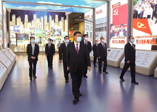新近落成的中國(guó)共產(chǎn)黨歷史展覽館巍然矗立,氣勢(shì)恢宏。下午3時(shí)20分許,習(xí)近平等黨和國(guó)家領(lǐng)導(dǎo)同志來(lái)到這里,步入展廳參觀展覽。展覽以“不忘初心、牢記使命”為主題,精心設(shè)計(jì)了“建立中國(guó)共產(chǎn)黨 奪取新民主主義革命偉大勝利”、“成立中華人民共和國(guó) 進(jìn)行社會(huì)主義革命和建設(shè)”、“實(shí)行改革開(kāi)放 開(kāi)創(chuàng)和發(fā)展中國(guó)特色社會(huì)主義”、“推進(jìn)中國(guó)特色社會(huì)主義進(jìn)入新時(shí)代 全面建成小康社會(huì) 開(kāi)啟全面建設(shè)社會(huì)主義現(xiàn)代化國(guó)家新(人民日?qǐng)?bào))征程”4個(gè)部分,通過(guò)2600余幅圖片、3500多件套文物實(shí)物,第一次全方位、全過(guò)程、全景式、史詩(shī)般展現(xiàn)中國(guó)共產(chǎn)黨波瀾壯闊的百年歷程,濃墨重彩地反映黨的不懈奮斗史、不怕?tīng)奚?、理論探索史、為民造福史、自身建設(shè)史,使人們深刻認(rèn)識(shí)到紅色政權(quán)來(lái)之不易、新中國(guó)來(lái)之不易、中國(guó)特色社會(huì)主義來(lái)之不易,深刻認(rèn)識(shí)到中國(guó)共產(chǎn)黨為什么能、馬克思主義為什么行、中國(guó)特色社會(huì)主義為什么好。