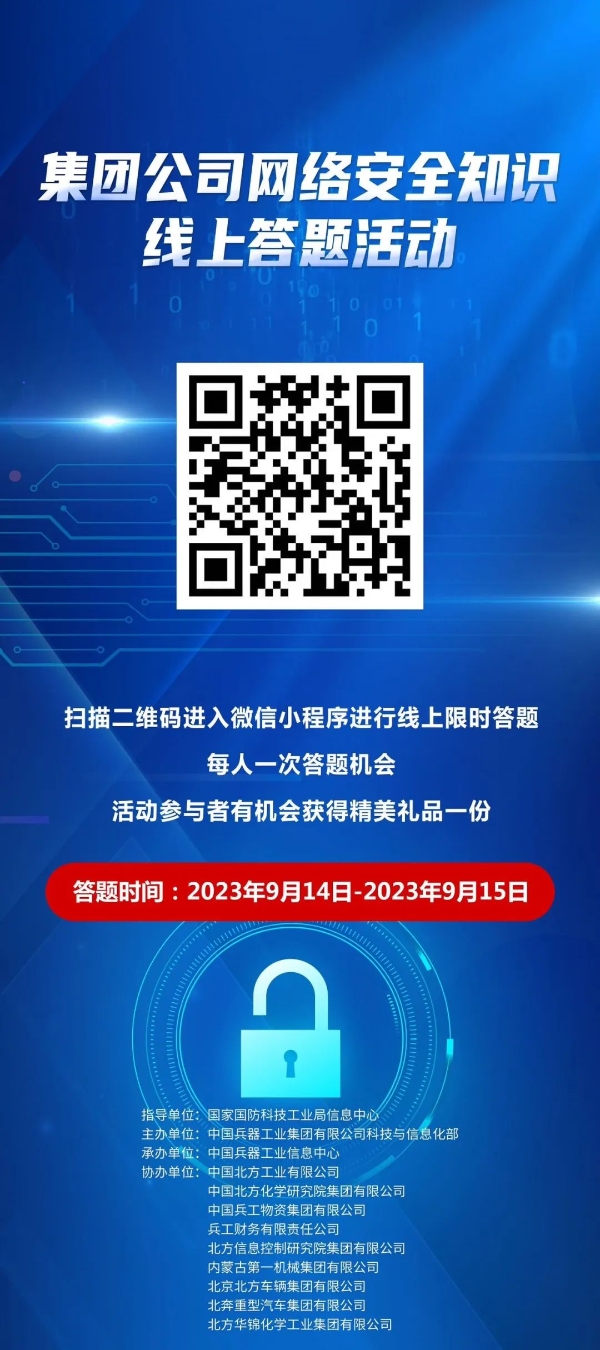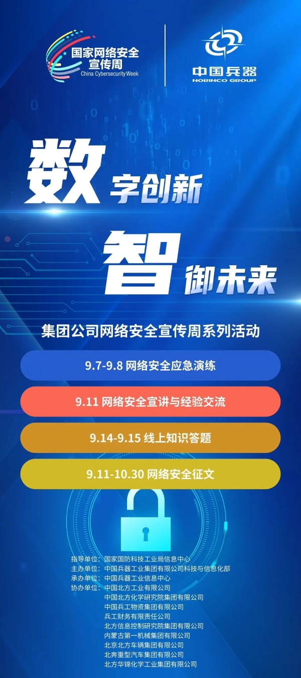 9月11日至17日,中國兵器工業(yè)集團(tuán)有限公司以“數(shù)字創(chuàng)新 智御未來”為主題,圍繞集團(tuán)公司“1+5”戰(zhàn)略和“雙十”規(guī)劃,組織開展集團(tuán)公司網(wǎng)絡(luò)安全宣傳周系列活動。 9月11日,集團(tuán)公司科技與信息化部組織在京單位召開網(wǎng)絡(luò)安全宣講與經(jīng)驗(yàn)交流活動,邀請公安部第一研究所網(wǎng)絡(luò)安全專家針對網(wǎng)絡(luò)安全形勢和個人防護(hù)技能以及網(wǎng)絡(luò)安全等級保護(hù)主要工作環(huán)節(jié)和標(biāo)準(zhǔn)應(yīng)用作專題講座,會上北方公司、物資集團(tuán)、財(cái)務(wù)公司、北方車輛集團(tuán)、北奔重汽進(jìn)行了工作經(jīng)驗(yàn)分享。