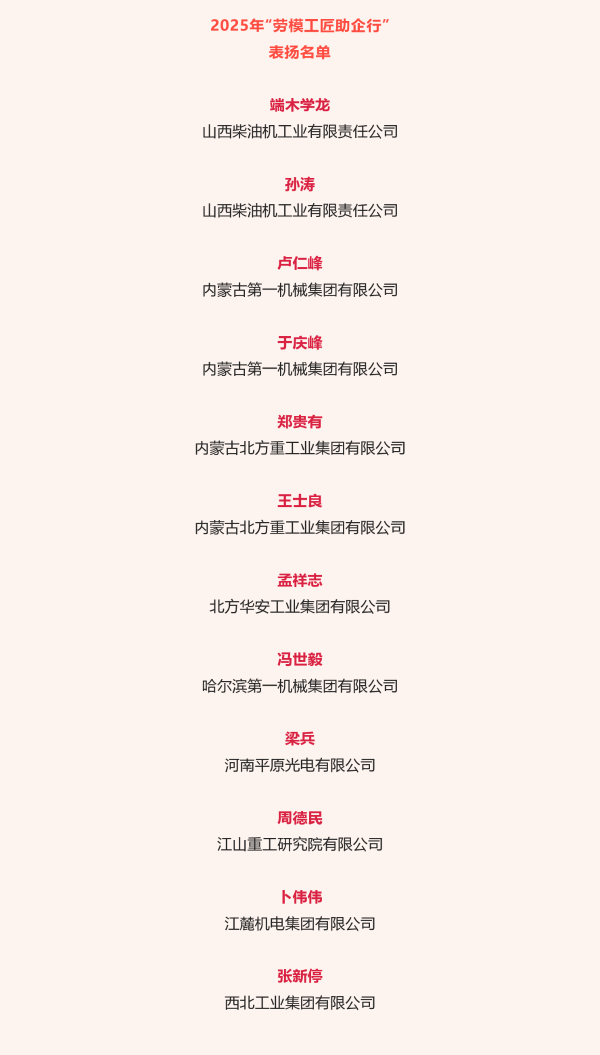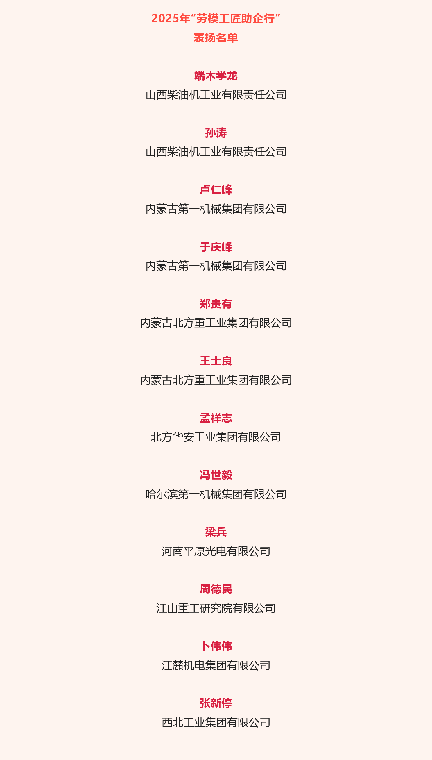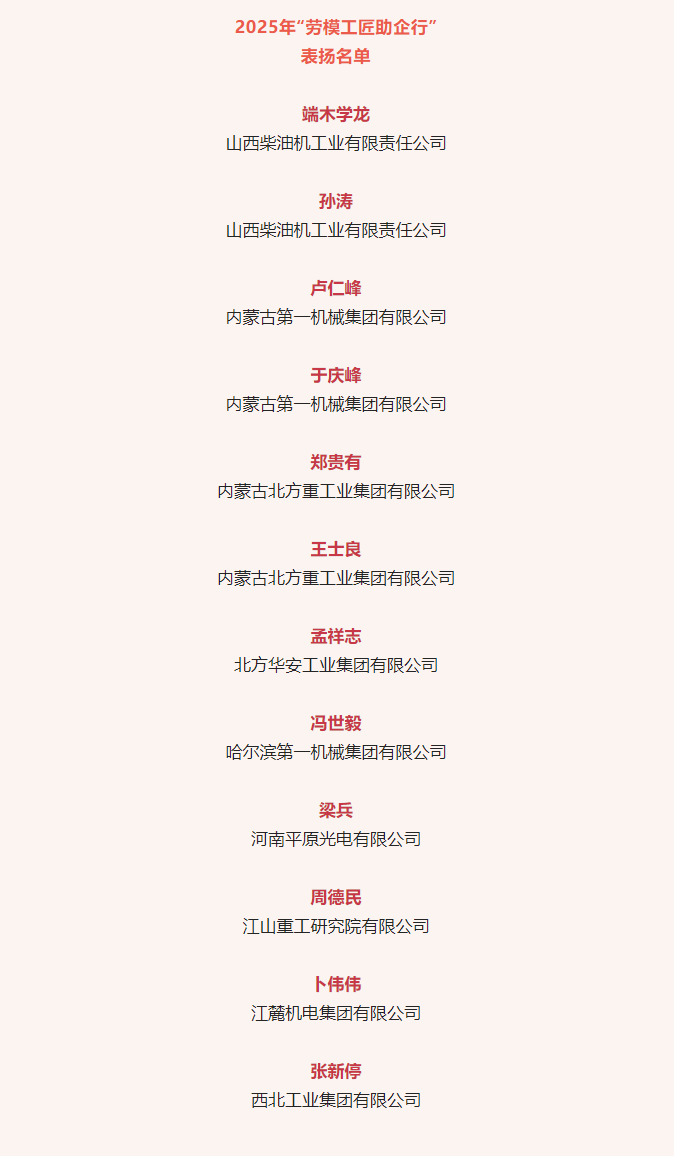 近日,中華全國(guó)總工會(huì)公布2025年“勞模工匠助企行”表揚(yáng)名單,兵器工業(yè)集團(tuán)12名勞模工匠入選。